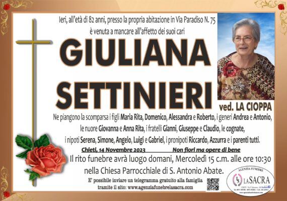 Anche se non la vedevo da tempo ero molto legato a “zia Giuliana” (così l’ho sempre chiamata!) che insieme a “zio Angelo” erano per me un esempio di famiglia perfetta e per questo mi addolora ancora di più la sua scomparsa. A voi figli e familiari facciamo le più sentite condoglianze.